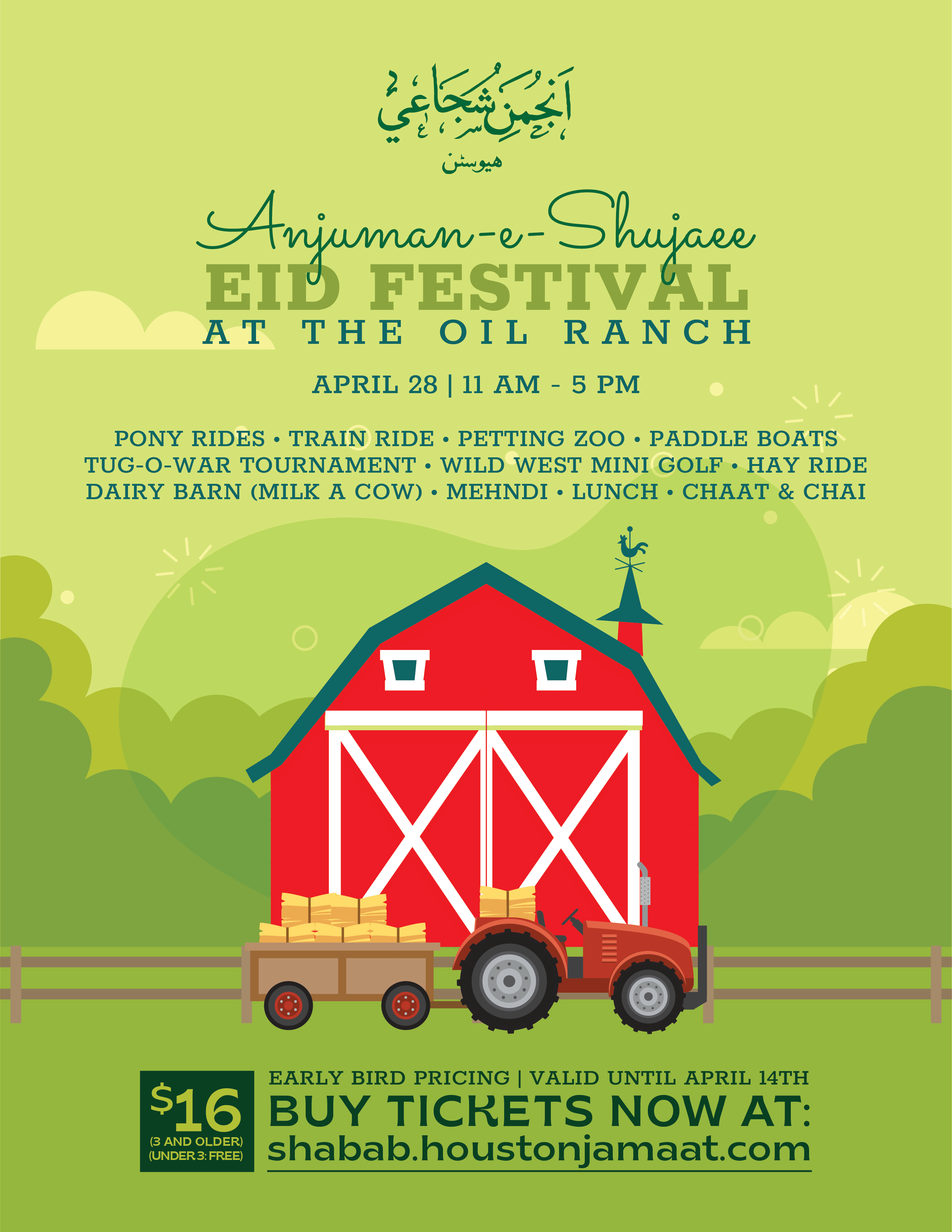 Anjuman-e-Shujaee invites you to the Annual Eid Festival on Sunday, April 28th, 2024- at the Oil Ranch! Join us for a fun-filled day, from 11 AM – 5 PM with exciting activities, including paddle boating, train rides, hay rides, pony rides, petting zoo, maze adventures, visits to the dairy barn, mini golf, board games, mehndi, lunch, chai & chaat, and much more!